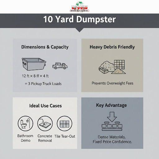 The 10 yard solves a specific problem that larger containers can’t—handling extremely heavy materials within weight limits. Concrete, tile, brick, and dirt hit tonnage caps fast regardless of container size. The 10 yard’s smaller volume prevents overloading while still providing enough capacity for substantial demolition or landscaping work. You pay for appropriate capacity rather than renting a half-empty 20 or 30 yard that exceeds weight limits at 40% full.
