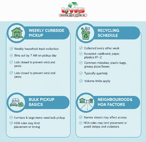 HOA-managed communities often have specific placement rules beyond city requirements—designated collection days, bin visibility restrictions, or container color mandates. Check community guidelines to avoid violations that trigger warnings or fines from both the HOA and city enforcement.