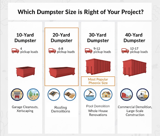 A 10-yard works for small bathroom or kitchen demos, 20-yard handles most residential construction and roof tear-offs, 30-yard suits new home construction, and 40-yard serves large commercial projects. For heavy materials like concrete, caliche, or desert construction debris, request an inert material dumpster with higher weight capacity.