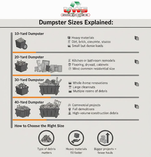Choosing appropriate container sizes prevents unnecessary costs from oversized rentals or mid-project exchanges from undersized capacity. Here’s practical guidance based on actual project requirements: