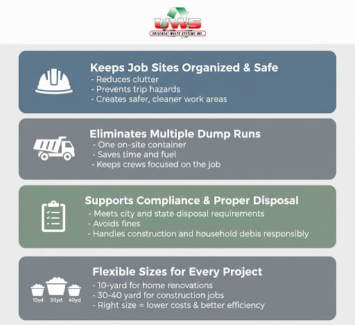 Large jobs demand durable waste solutions. Dumpsters hold mixed debris, demolition waste, and leftover materials, helping crews maintain safer, more orderly worksites. Their availability supports proper waste handling on active job sites