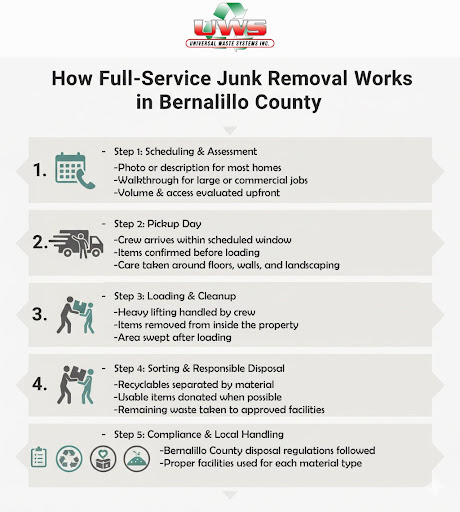 That’s where full-service junk removal comes in. Our crews at Universal Waste Systems handle the loading, hauling, and disposal across Bernalillo County—residential cleanouts, office clearances, and construction debris all get the same efficient treatment. Ready to reclaim your space? Request a quote or call us to schedule your pickup.