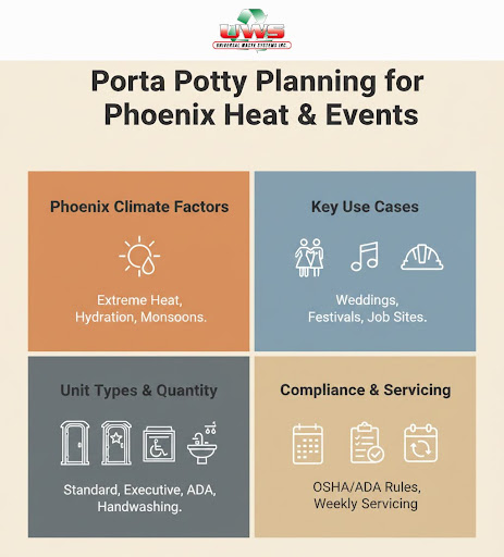 - Not sure which porta potty setup fits your Phoenix project? Universal Waste Systems reviews your event type, attendance, and site conditions to match you with the right units and servicing schedule. Request a quote or call us today for expert guidance.