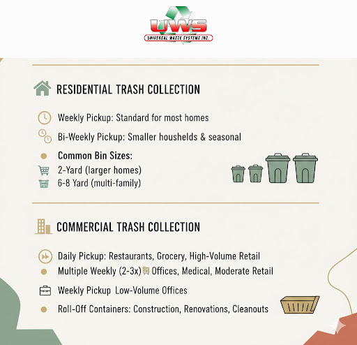 - Need help determining the right pickup schedule? Universal Waste Systems reviews your property type, waste volume, and operational patterns to recommend optimal service frequency. We help you avoid overpaying for unnecessary pickups or dealing with overflow from insufficient service. Contact us for a customized trash collection plan.